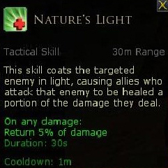 With Nature’s Light skill any of your fellowship who attack targeted enemy will receive 5% of their damage back as a heal, but the healing returned is too low. - Nature's Gift